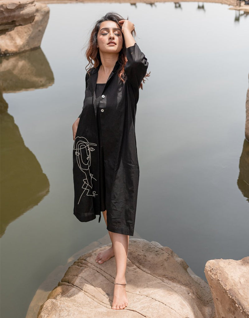 Our Artsy Black Blazer Dress is a harmonious blend of style and comfort, crafted from the finest cotton hand-loomed fabric in a royal black colour.