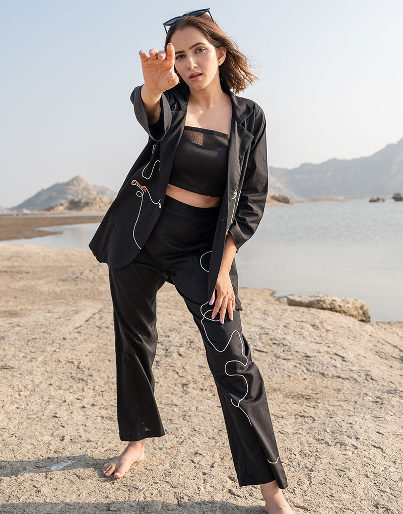 The model is wearing size S. This is a comfortable fit co-ord. Kindly go for your waist measurements as per the size guide.