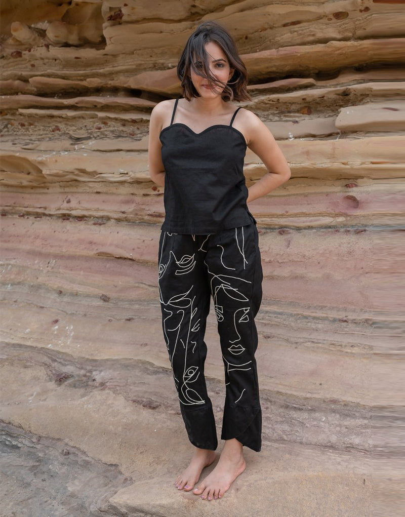 Artsy Black Criss-Cross Pant – a fashion statement with a twist! Crafted from comfy cotton hand-loomed fabric in timeless black, these pants offer a straight silhouette and a cozy fit. They’re not your average pants!With a half belt, half elastic waist for the perfect fit, delightful ruffle detailing, and two deep pockets, these pants are both stylish and practical. But here’s the real fun part – the eye-catching Criss Cross pattern at the bottom and charming hand embroidery, making these pants a head-turning addition to your wardrobe.Dress them up or down, these pants are ready for any adventure, adding a touch of style to your everyday style. Get ready to strut your stuff and stand out in our Artsy Black Criss-Cross Pant!