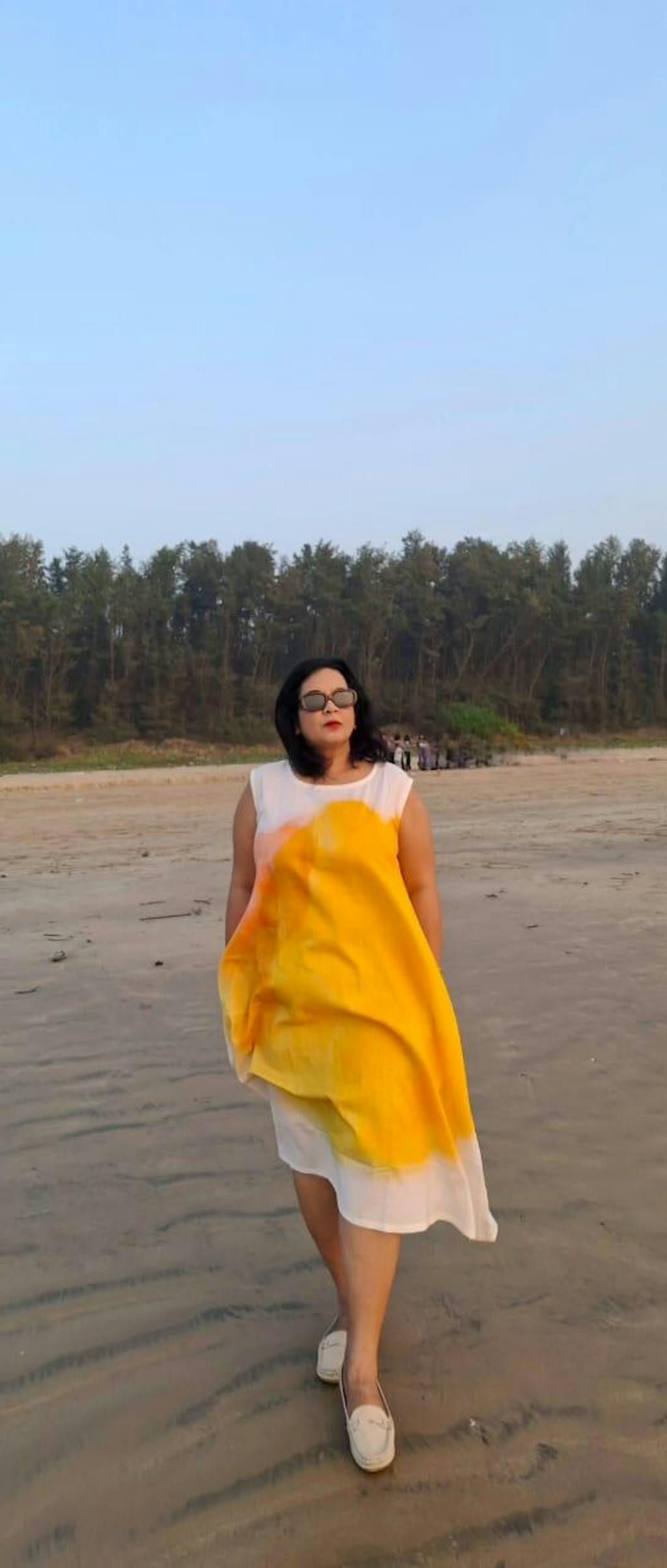 Indulge in this Artsy Black Dreamy Dress crafted from cotton hand-loomed fabric, with a round neck, sleeveless design, and comfortable fit. The flared silhouette and extra sleeves add a quirky touch, while embroidery at the front and two pockets add convenience. Perfect for playful, dreamy days.