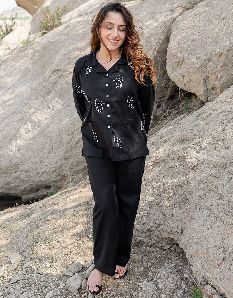 Get artsy with our Black Moody Shirt! Made from hand-loomed cotton for ultimate comfort. Features a regular shirt collar and full sleeves with front closure shell buttons. Embroidery at the front and back adds a unique touch. The straight silhouette and loose fit make it perfect for any occasion.