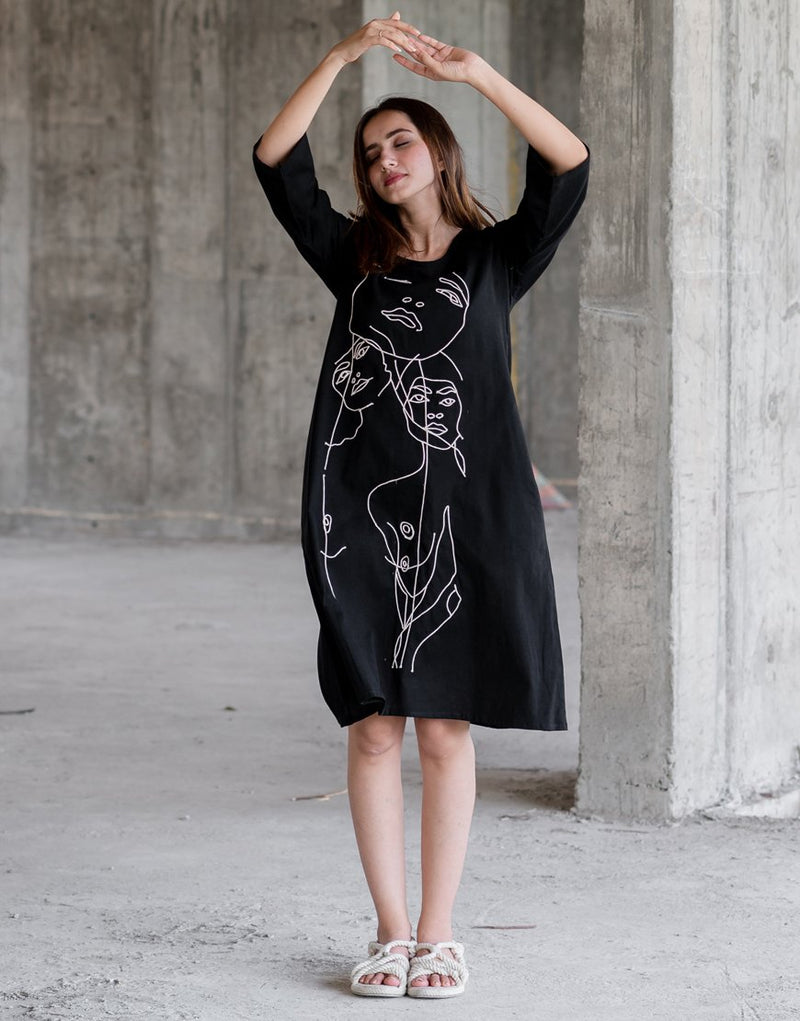 The model is wearing size S. This is a loose-fit, straight dress. Kindly go for a size down for a comfortable look.