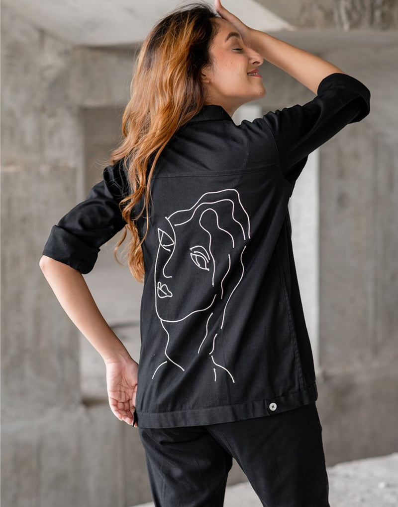 Add a smart finishing touch to your outfits with this cotton hand loomed jacket. It’s cut to a straight silhouette, full sleeves with cuffs and shell buttons. It has a shirt collar with shell buttons at the front closure. Tailored with hand embroidery at the back.