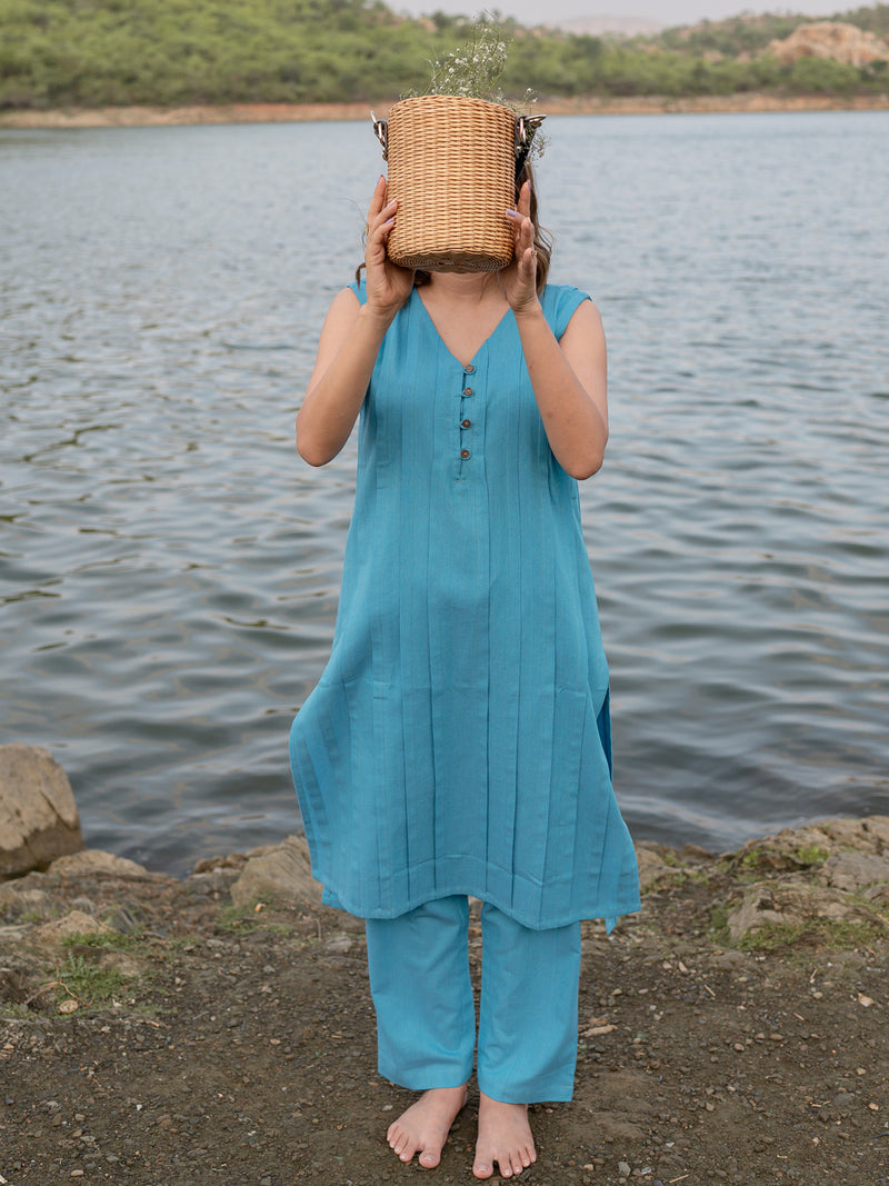 - Silhouette: Sleeveless straight-fit kurta with knife pleats for a clean, tailored look
