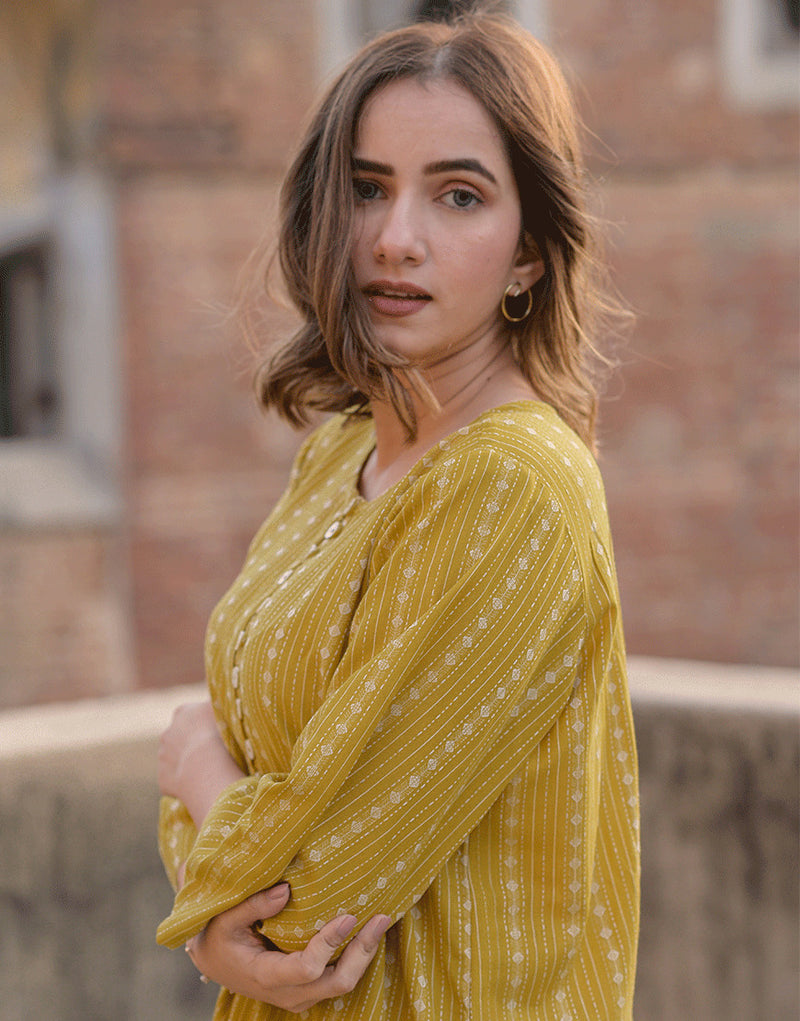 Relax in style with Babli's breezy cotton kurta set. Featuring a classic yellow and cream weave, the comfortable kurta boasts a round neckline and 3/4th sleeves. Paired with straight, elasticated pants and spacious pockets, this set offers both comfort and charm. Ideal for laid-back days.