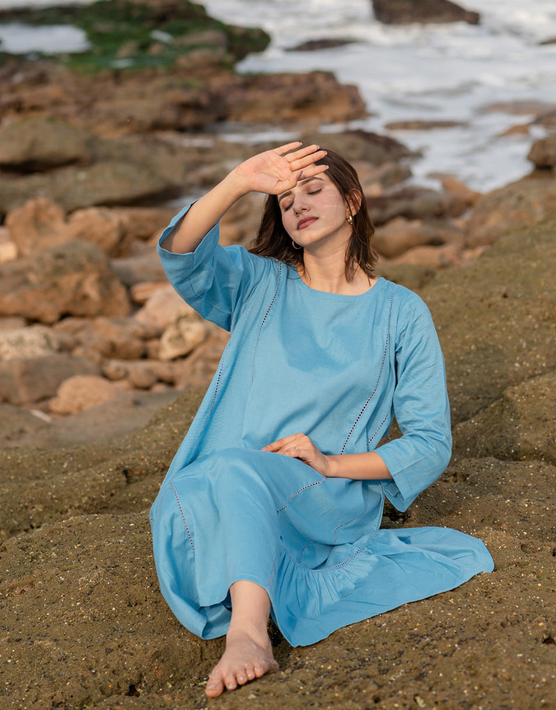 - Flared silhouette with gathering at the hem for a flowy, feminine vibe