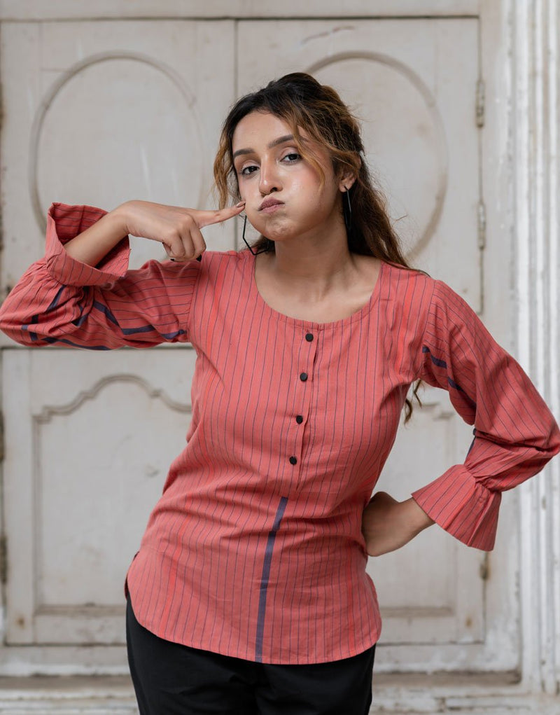 Playful with its utterly charming details, this carrot red striped top is the perfect pick to enliven your days. Made of cotton hand loomed fabric and topped with long sleeves and soft elastic and the cuff, the top is designed with front closure and metal buttons. It is round necked, straight silhouette giving it a comfy look.