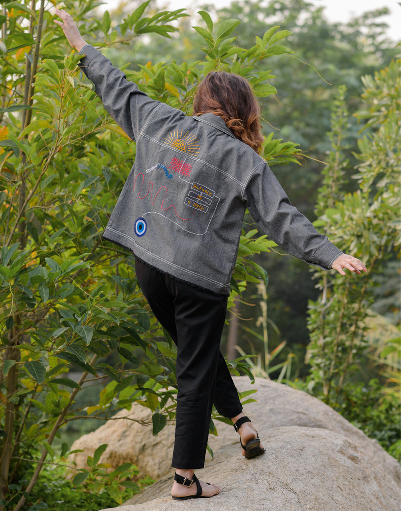 Introducing our chic Denim Greyish Hand-Loomed Cotton Jacket, meticulously crafted for timeless style and comfort. Featuring full sleeves with cuffs and a regular shirt collar, this jacket exudes effortless sophistication