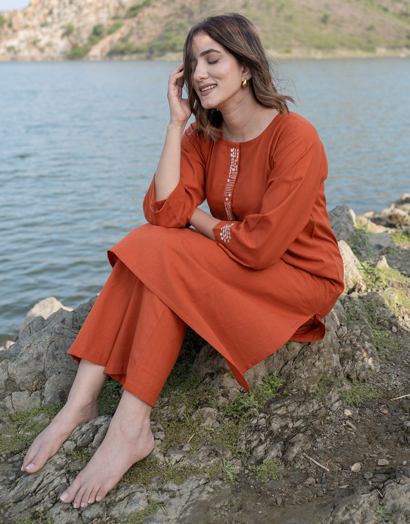 The model is wearing a size S. It features a straight-fit kurta and straight bottom—a comfortable co-ord.