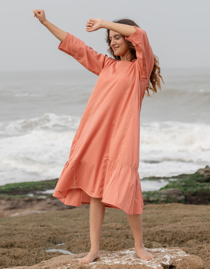 - Flared silhouette with gathering at the hem for a flowy, feminine vibe