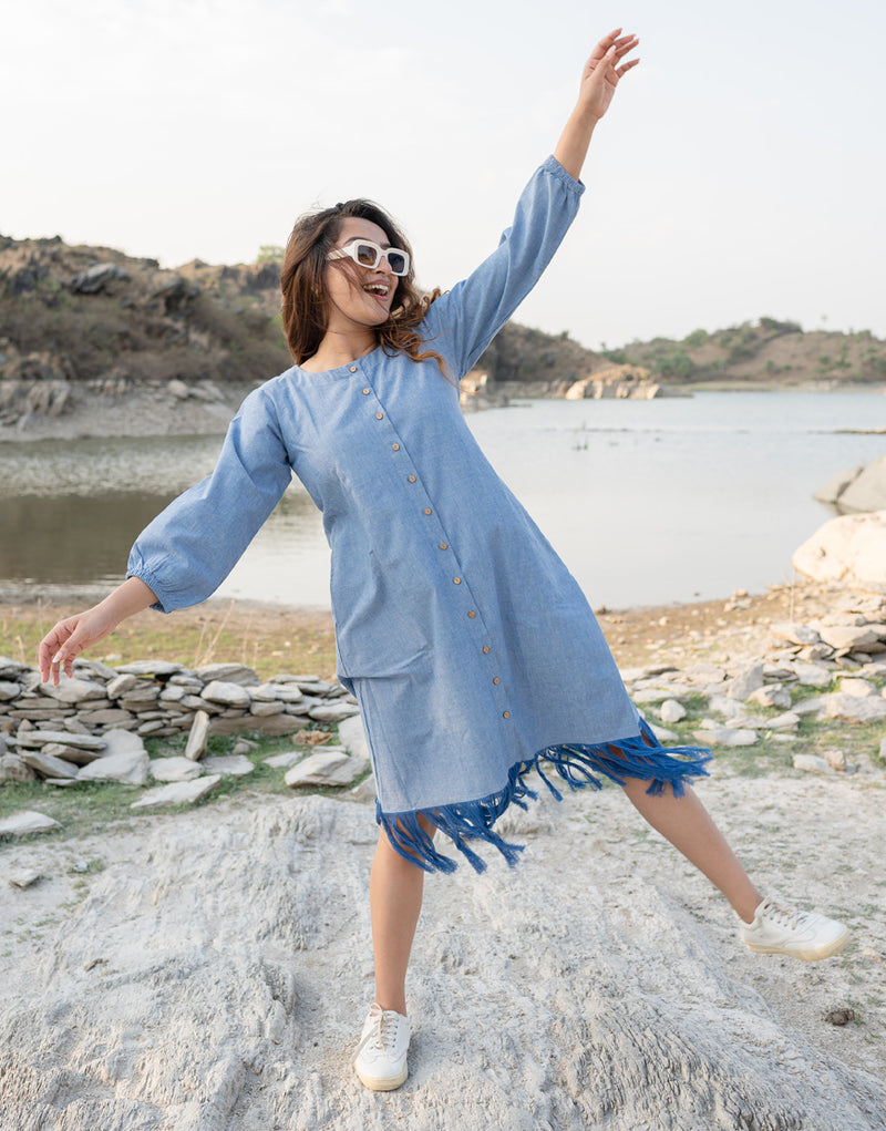 - The fringed hemline adds a unique, bohemian touch, making the outfit stand out.