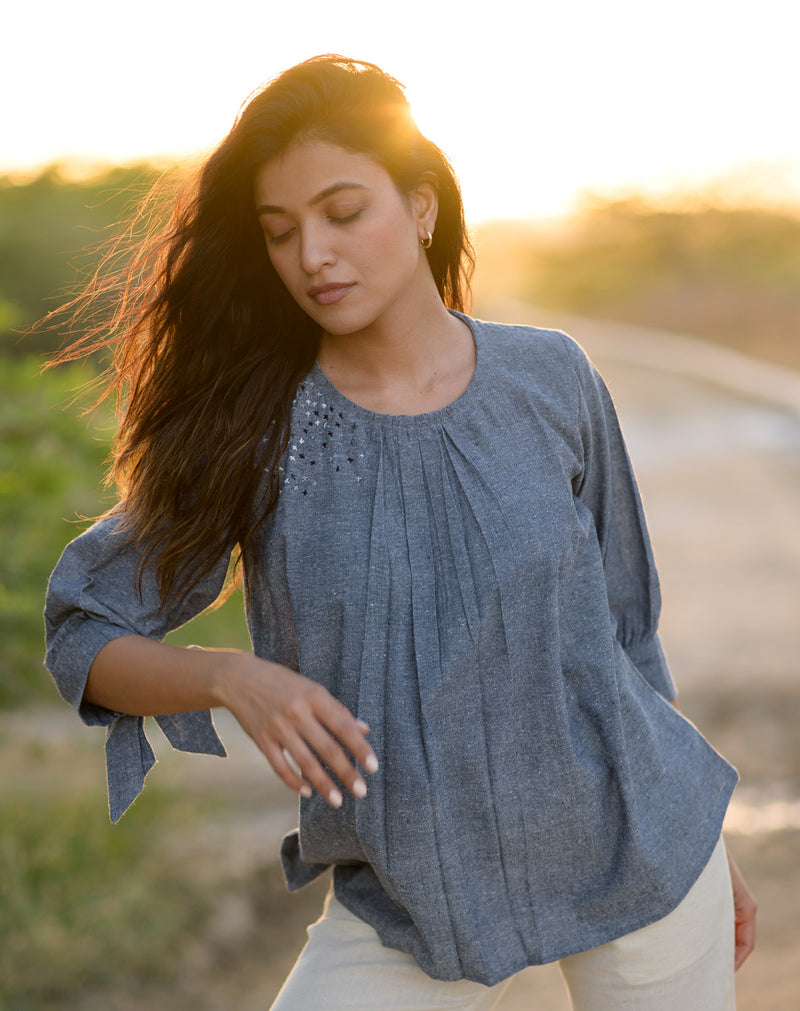 - Soft gathers on sleeves and neckline