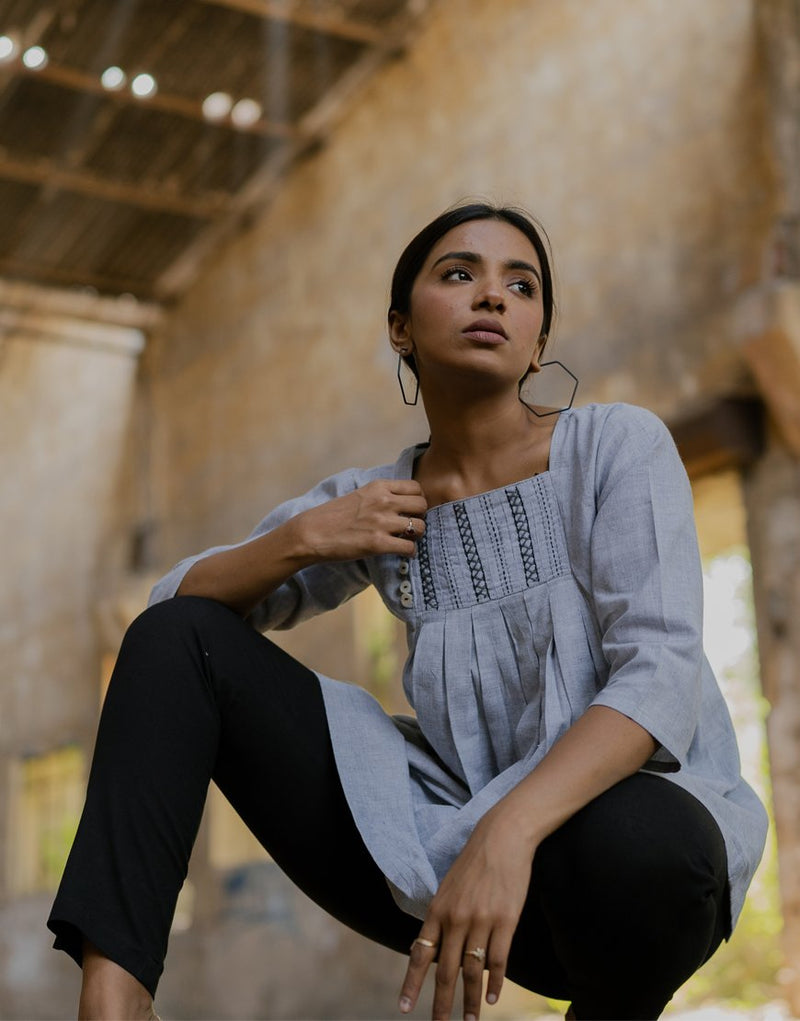 Get ready to make a statement with this Grey Embroidered Top! Crafted from hand-loomed cotton fabric, this top features a square neck, 3/4th sleeves, and a front half closure with shell buttons. The pleats at the front and hand embroidery on the yoke add an extra touch of elegance. With its flared silhouette and comfort fit, you’ll be sure to look your best in this top!