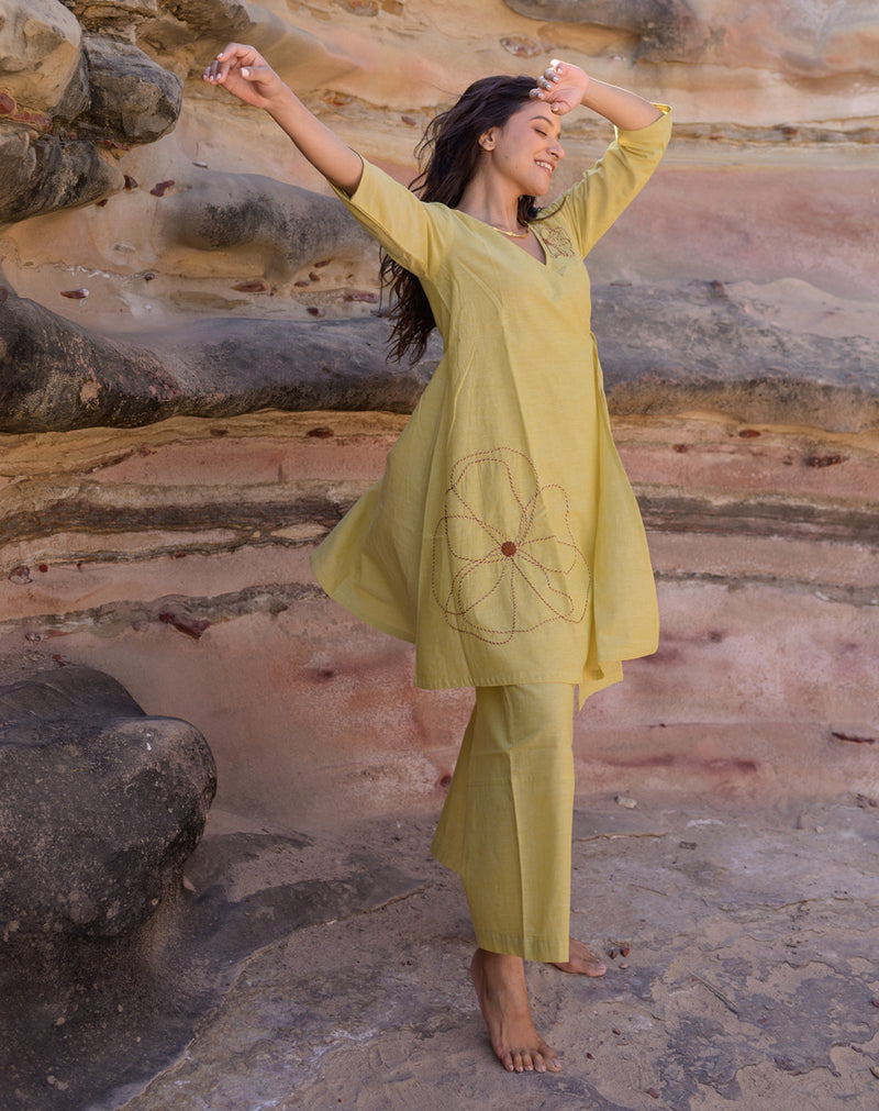 The model is wearing a size S. It features a flary and wrap around kurta and flared bottom a comfortable co-ord.