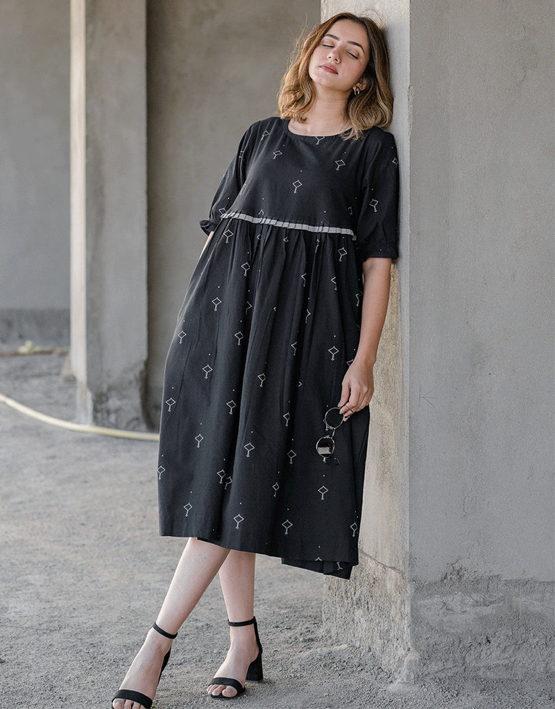 Introducing our Black Cotton Hand-Loomed Dress, a chic blend of comfort and sophistication. Crafted from premium cotton with a stylish white weave, this dress features a classic round neck and half sleeves adorned with ruffles and soft elastic for a touch of elegance. With two deep pockets and a flattering flared silhouette accentuated by ruffles on the waist, it offers both style and practicality. Designed for a comfortable loose fit, it's perfect for any occasion