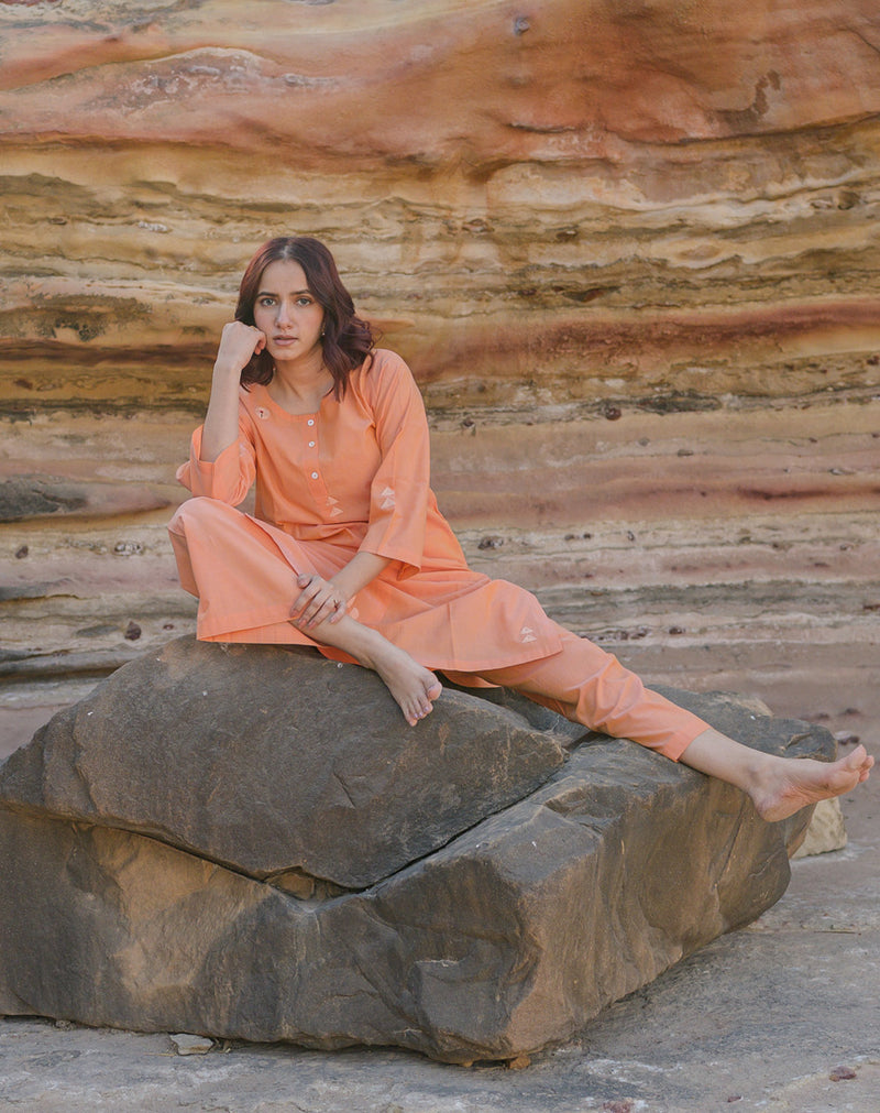 The model is wearing a size S. It features a straight fit kurta and flared bottom a comfortable co-ord.