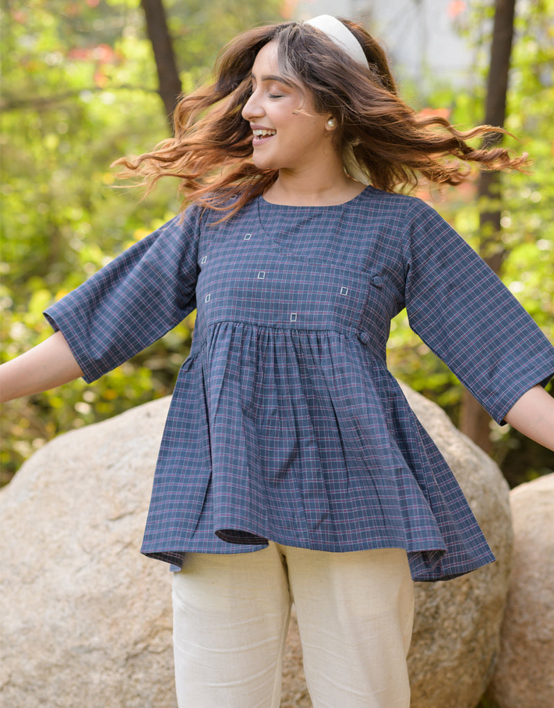 Introducing our exquisite Blue Hand-Loomed Cotton Angrakha Top, a fusion of tradition and modernity. Adorned with intricate hand embroidery and featuring a unique angrakha style, this top exudes elegance. With half sleeves, a round neck, and fabric buttons for show, it offers both sophistication and charm.