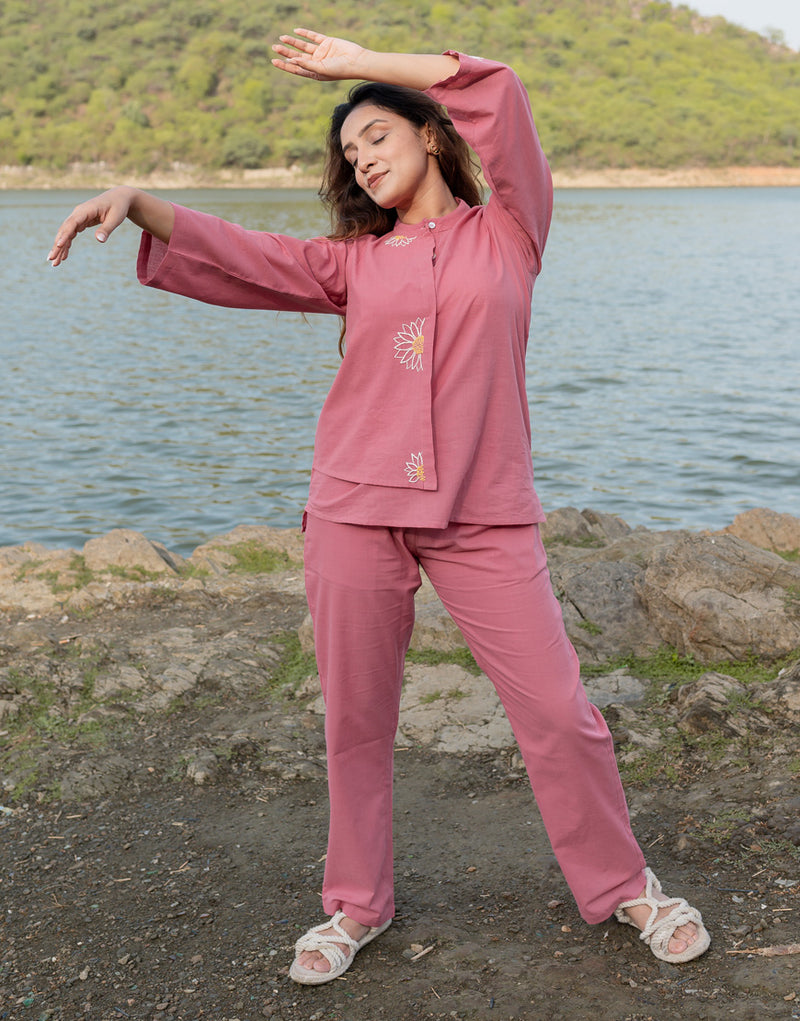 The model is wearing a size M. It features a straight-fit top and straight bottom—a comfortable co-ord.