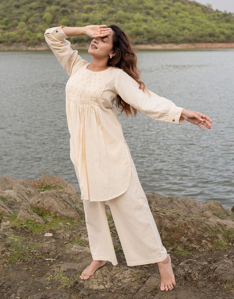 The model is wearing a size M. It features a loose-fit, kurta and flared bottom—a comfortable co-ord.
