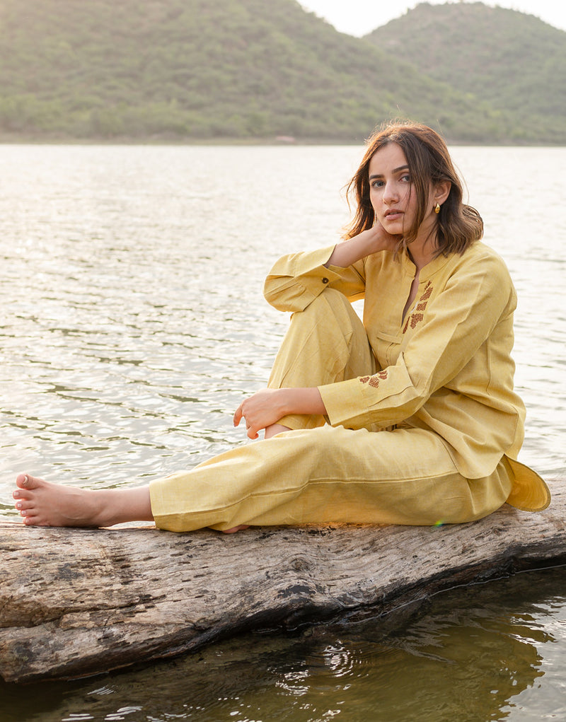 - Embroidery: Delicate hand embroidery on the neckline, sleeves, and bottom corner of the top