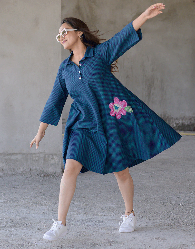 Introducing our Indigo Blue Checks Cotton Hand-Loomed Dress, a timeless fusion of comfort and elegance. Crafted from premium cotton with a charming checked pattern, this dress features a classic standard collar and 3/4th sleeves for a sophisticated look.