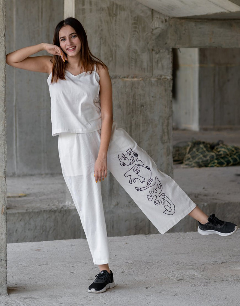 Make a statement with this hand loomed cotton palazzo! It is cinched at the waist and has hand embroidery at the front with two side pockets. The bottoms are wide leg and have an elastic strap at the back, which makes them very comfortable. Wear it to create a trendy look!